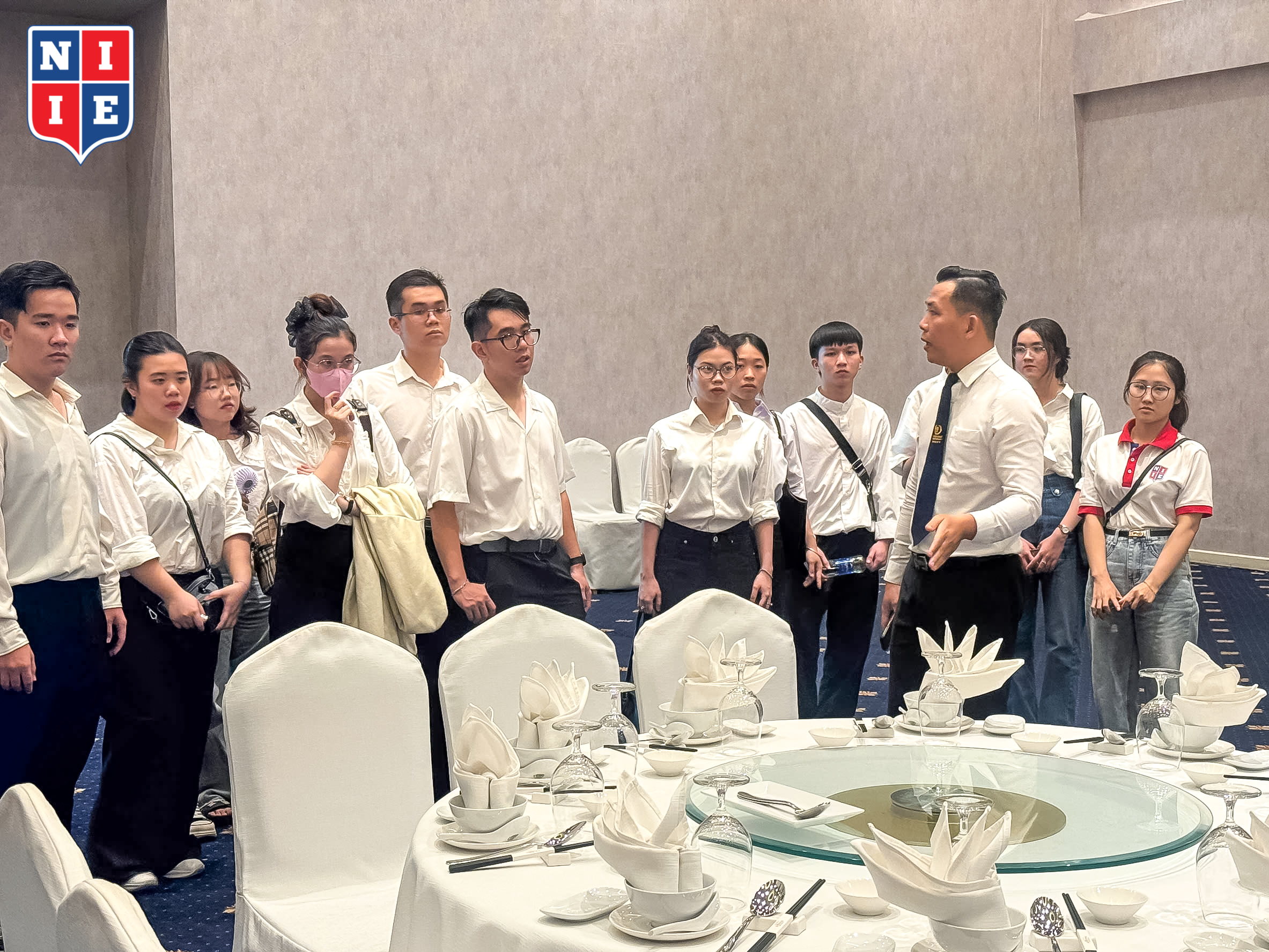 Tiếp đó, chuyến đi dẫn lối sinh viên đến khu vực sảnh tiệc và lobby, nơi quy tụ hơn 15 sảnh tiệc cao cấp đa chức năng với sức chứa lên đến 8000 khách – phục vụ từ tiệc cưới, hội nghị đến gala doanh nghiệp. Qua quá trình quan sát và thực hành cơ bản, các bạn được hướng dẫn cách: